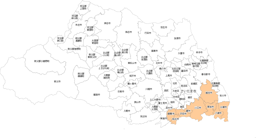 八潮市、越谷市、草加市、三郷市、川口市、戸田市、蕨市