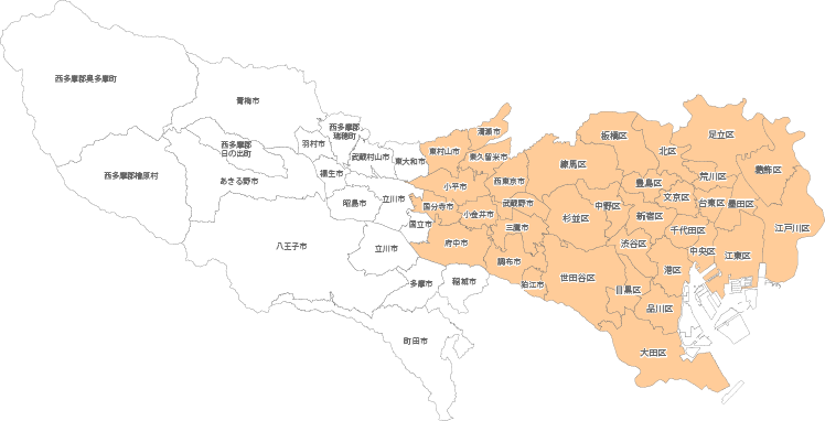 足立区、葛飾区、江戸川区、武蔵野市、三鷹市、府中市、調布市、小金井市、小平市